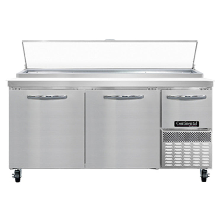 Continental Refrigerator PA68N Pizza Prep Table 68"W Two-section is an advanced solution for pizzerias and commercial kitchens, combining efficiency and robust construction to enhance food preparation workflows. This prep table boasts a substantial 22.0 cubic feet capacity, powered by a 1/3 HP motor and utilizing R290 Hydrocarbon refrigerant for environmentally friendly cooling. Its forced air system ensures consistent temperature control across the 300 series stainless steel worktop, complemented by a 19" poly cutting board, providing a durable surface for pizza preparation. The unit's design includes two full and one half-height field rehingeable doors, offering versatile access while optimizing storage organization. With its hot gas condensate evaporator, stainless steel front and end panels, and aluminum interior, the PA68N is built for durability and ease of maintenance. Featuring electronic control and off cycle defrost, it ensures reliable performance and energy efficiency. The side-mounted refrigeration system is enhanced by a reversing condenser fan, promoting optimal airflow. Certified by cETLus and NSF, this pizza prep table adheres to stringent safety and quality standards, making it a valuable choice for diverse market segments requiring dependable refrigeration solutions in high-demand food service environments.
