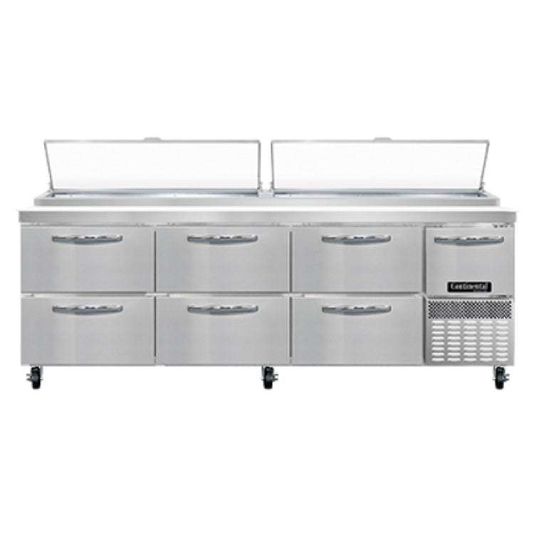 The Continental Refrigerator PA93N-D Pizza Prep Table is a versatile and efficient solution for food service operations requiring ample workspace and refrigeration. With a width of 93 inches, this three-section unit boasts a substantial capacity of 32.0 cubic feet, utilizing a forced air system to maintain optimal temperature control. The prep table features a durable 300 series stainless steel work top, complemented by a 19-inch poly cutting board, providing a robust surface for food preparation. Its unique configuration includes six drawers, each capable of holding two 12 x 20 x 6 pans, though pans are supplied separately. Additionally, it includes one half-height field rehingeable door, offering flexible access. The design incorporates a hot gas condensate evaporator, ensuring efficient operation, while the stainless steel front and end panels and aluminum interior enhance its durability and aesthetic appeal. The electronic control enables precise temperature management, with an off-cycle defrost function for convenience. Its side-mounted refrigeration system, equipped with a reversing condenser fan, leverages R290 Hydrocarbon refrigerant, contributing to a 1/2 HP performance. Certified by cETLus and NSF, this prep table stands as a reliable and compliant choice for culinary establishments seeking functionality and regulatory adherence.
