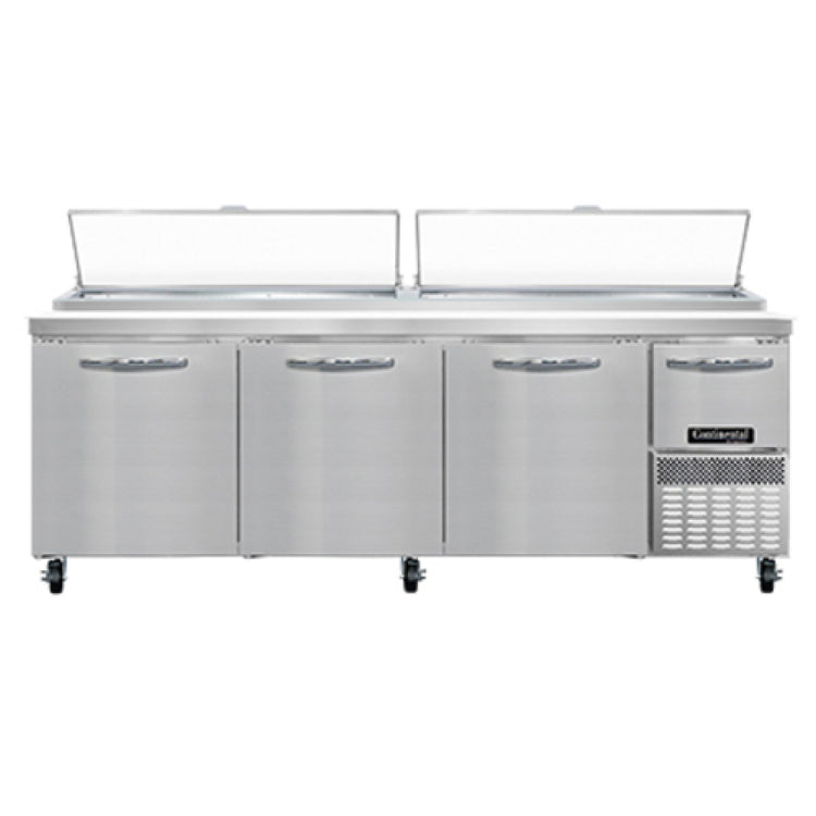 The Continental Refrigerator PA93N Pizza Prep Table - 93"W Three-section is a state-of-the-art refrigeration unit designed for optimizing pizza preparation in commercial kitchens. With a substantial capacity of 32.0 cubic feet, this unit efficiently utilizes forced air technology to maintain optimal temperatures. The prep table features a 300 series stainless steel work top coupled with a spacious 19" poly cutting board, facilitating streamlined food preparation tasks. Equipped with three full and one half-height field rehingeable door, the PA93N offers versatile storage solutions. The integration of a hot gas condensate evaporator enhances its efficiency, while the robust stainless steel front and end panels ensure durability. Inside, the aluminum interior supports hygiene and easy cleaning. An advanced electronic control system and off-cycle defrost function further enhance its operational efficiency. This model incorporates a side-mounted refrigeration unit and a reversing condenser fan, utilizing eco-friendly R290 Hydrocarbon refrigerant. The PA93N is powered by a 1/2 horsepower motor and meets the cETLus and NSF certifications, emphasizing its adherence to safety and quality standards. This pizza prep table is ideal for various market segments within the foodservice industry, offering a perfect blend of functionality and modern refrigeration technology.
