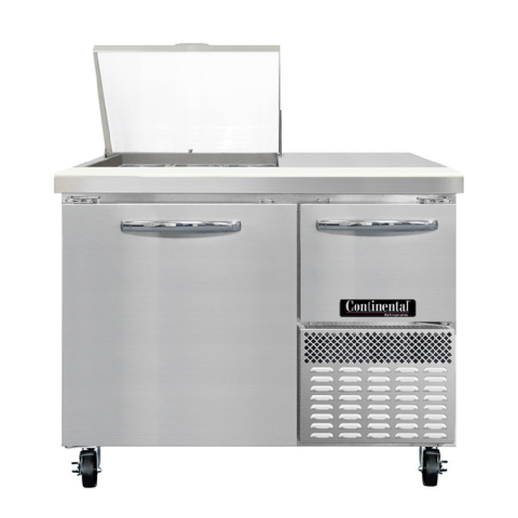 The Continental Refrigerator RA43N9M Refrigerated Base Sandwich Unit is a high-performance unit designed for professional kitchen environments. Measuring 43 inches in width, it features a robust 300 series stainless steel top, known as the "Mighty" top, providing durability and a sleek appearance. This unit is equipped with (9) 1/6 size x 4-inch deep pans, making it ideal for efficiently organizing ingredients. The construction includes a stainless steel front and sides, complemented by a galvanized steel case back and an aluminum interior, ensuring longevity and ease of maintenance. A 10-inch deep nylon cutting board adds a practical workspace for food preparation. The unit includes (1) full and (1) half height field rehingeable doors for flexible access. Its electronic control system enhances user convenience, while the off cycle defrost controller and hot gas condensate evaporator optimize refrigeration performance. Powered by a 1/4 HP side-mounted refrigeration system, it utilizes R290 Hydrocarbon refrigerant, which is environmentally friendly. The RA43N9M is cETLus and NSF certified, verifying its compliance with safety and sanitation standards. This refrigerated base sandwich unit is ideal for restaurants, cafes, and other food service operations requiring reliable, efficient, and organized cold storage solutions.
