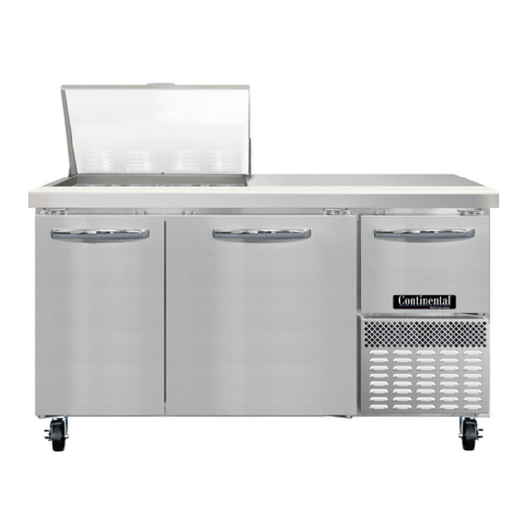 The Continental Refrigerator RA60N12M Refrigerated Base Sandwich Unit is a versatile and efficient refrigeration solution ideal for various food service operations. With a width of 60 inches, this unit is constructed from durable 300 series stainless steel, featuring a robust "Mighty" top. It includes twelve 1/6 size pans, each 4 inches deep, providing ample storage for ingredients and toppings, essential for sandwich prep areas in delis and restaurants. The unit's exterior boasts a stainless steel front and sides, while the back is made of galvanized steel, and the interior is lined with aluminum for added resilience. For convenience, a 10-inch deep nylon cutting board is included, making preparation tasks more manageable. It features two full and one half-height field rehingeable doors, allowing for customizable access based on kitchen layout. The refrigeration system is side-mounted and powered by a 1/3 HP compressor, utilizing R290 Hydrocarbon refrigerant for environmentally friendly cooling. The advanced electronic control system supports off cycle defrost and a hot gas condensate evaporator, ensuring efficient and reliable operation. Certified by cETLus and NSF, the RA60N12M unit is well-suited for any establishment needing a dependable, adaptable refrigerated base for sandwich preparation.