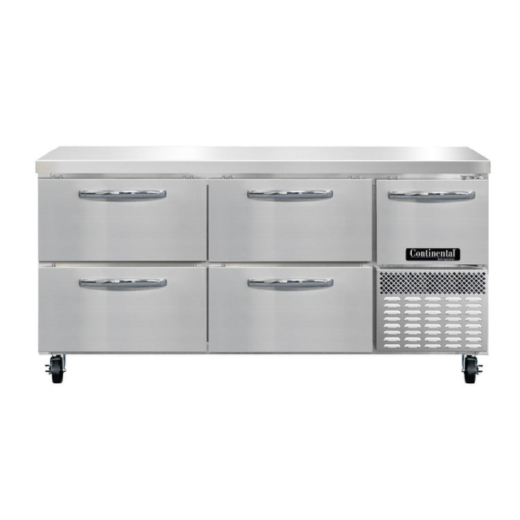 The Continental Refrigerator RA68N-D Refrigerated Base Worktop Unit 68"W is a versatile refrigeration solution, crafted with a 300 series stainless steel flat work top for durability and easy cleaning, making it ideal for commercial kitchens. The unit features stainless steel front and end panels, with a galvanized steel rear and grill, ensuring robust construction and long-term reliability. Its aluminum interior is designed to maximize cooling efficiency. This unit includes four drawers, each capable of holding two 12" x 20" x 6" pans, allowing for substantial storage capacity, though pans are not supplied. Additionally, it has a unique half-height field rehingeable door, providing flexible access and usability, tailored for different kitchen layouts. The RA68N-D operates with an electronic control system and an off-cycle defrost mechanism, driven by a 1/4 HP side-mounted refrigeration unit that utilizes R290 hydrocarbon refrigerant, promoting energy efficiency and environmental sustainability. Certified by cETLus and NSF, this refrigerated base worktop unit assures compliance with safety and sanitation standards, making it a dependable choice for various segments within the food service industry looking for reliable refrigeration solutions that combine efficiency with adaptability.