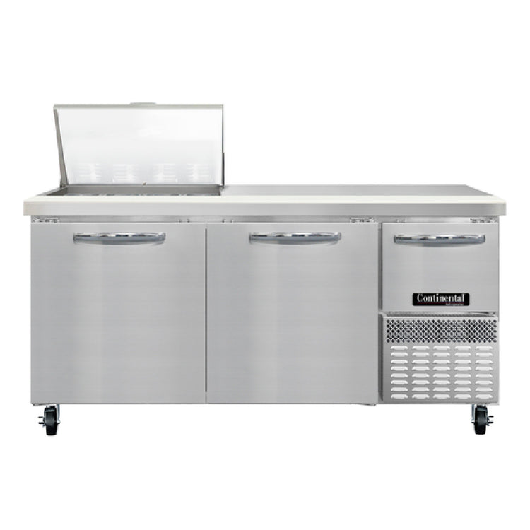 The Continental Refrigerator RA68N12M Refrigerated Base Sandwich Unit is a robust and versatile solution for food service operations. With dimensions of 68"W, this unit boasts a top crafted from 300 series stainless steel, designated as the "Mighty" top, ensuring durability and resistance to wear. It is equipped with (12) 1/6 size x 4" deep pans, providing significant capacity for ingredient organization. The unit features a stainless steel front and sides, complemented by a galvanized steel case back and an aluminum interior, offering a balance of strength and lightweight efficiency. A 10" deep nylon cutting board adds convenience for preparation tasks. The unit's design includes (2) full and (1) half height field rehingeable doors, enhancing accessibility and flexibility in tight spaces. Advanced electronic controls, off cycle defrost, and a hot gas condensate evaporator contribute to efficient operation. Powered by a 1/3 HP compressor with side-mounted refrigeration, it utilizes R290 Hydrocarbon refrigerant, aligning with eco-friendly standards. cETLus and NSF certifications underscore its compliance with safety and sanitation requirements, making it a reliable choice for diverse applications in the food industry.