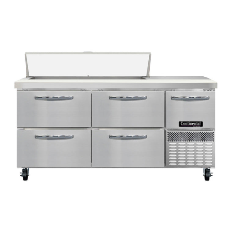 The Continental Refrigerator RA68SN12-D Refrigerated Base Shallow Depth Sandwich Unit is a versatile and compact solution for culinary professionals, offering a 68-inch wide worktop crafted from 300 series stainless steel. This unit is equipped with twelve 1/6 size x 4-inch deep pans, providing ample preparation space for sandwich and salad assembly. Its exterior is fortified with stainless steel on the front and sides, while a galvanized steel case back ensures durability. An aluminum interior supports efficient cooling, complemented by a 10-inch deep nylon cutting board for convenient meal preparation. The unit features four drawers, each accommodating one 12 x 20 x 6 pan (supplied by others), along with a half-height, field-rehingeable door for customizable access. Advanced electronic controls, off-cycle defrost, and a hot gas condensate evaporator enhance operational efficiency. With a 1/3 HP side-mounted refrigeration system utilizing R290 Hydrocarbon refrigerant, this unit meets eco-friendly standards. Certified by cETLus and NSF, the RA68SN12-D is engineered to serve various segments within the food service industry, providing reliable refrigeration in a shallow depth format for space-constrained environments.