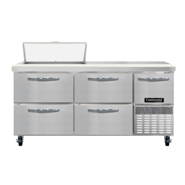 The Continental Refrigerator RA68SN8-D Refrigerated Base Shallow Depth Sandwich Unit is a meticulously engineered piece of kitchen equipment, perfect for various foodservice environments. With a width of 68 inches, this unit is crafted from 300 series stainless steel, ensuring durability and longevity. It features a stainless steel front and sides, and a galvanized steel case back, accompanied by an aluminum interior for optimal insulation. The top accommodates eight 1/6 size x 4-inch deep pans, making it ideal for storing sandwich ingredients within easy reach. A 10-inch deep nylon cutting board provides a convenient prep surface. The refrigerated base includes four drawers, each capable of holding a 12 x 20 x 6 pan, and a half-height field rehingeable door for versatile storage options. Its electronic control system ensures precision in temperature regulation, while the off-cycle defrost and hot gas condensate evaporator enhance operational efficiency. Powered by a 1/3 HP side-mounted refrigeration system, it uses R290 Hydrocarbon refrigerant, aligning with eco-friendly standards. Certified by cETLus and NSF, this unit guarantees compliance with safety and sanitation standards. The RA68SN8-D is an indispensable asset for sandwich shops, delis, and other fast-paced foodservice operations looking for reliable refrigeration solutions.