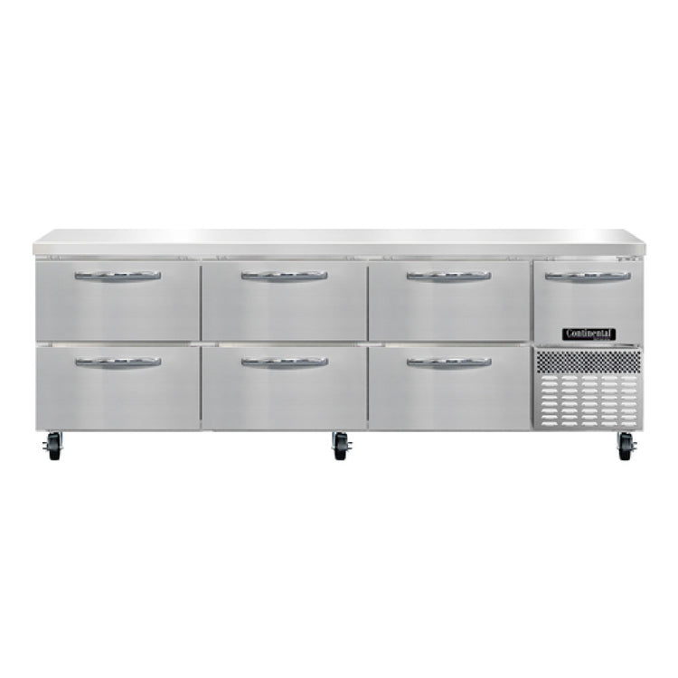 The Continental Refrigerator RA93N-D Refrigerated Base Worktop Unit is a 93-inch wide unit expertly crafted with a 300 series stainless steel flat work top, ensuring durability and a sleek appearance. This unit features stainless steel front and end panels, with a galvanized steel rear and grill, providing a robust and reliable structure. The interior is made of aluminum, enhancing its strength while maintaining a lightweight design. It includes six drawers, each capable of holding two 12 x 20 x 6 pans (provided by others), and a half-height field rehingeable door for versatile storage options. The electronic control system and off cycle defrost feature ensure precise temperature regulation and energy efficiency. Powered by a 1/4 HP side-mounted refrigeration system using R290 hydrocarbon refrigerant, it promises environmentally friendly operation. Certified by cETLus and NSF, the RA93N-D Refrigerated Base Worktop Unit meets high standards of safety and sanitation, making it ideal for various segments within the food service industry, including restaurants, catering services, and commercial kitchens. This unit's innovative design and superior build quality provide a reliable solution for professionals seeking efficient refrigerated storage and workspace integration.