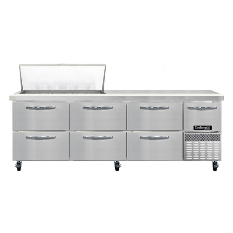 The Continental Refrigerator RA93N18M-D Refrigerated Base Sandwich Unit is a versatile and robust solution designed for commercial kitchens requiring efficient refrigerated storage. With a width of 93 inches, this unit features a top constructed of 300 series stainless steel, known as the "Mighty" top, accommodating (18) 1/6 size x 4-inch deep pans. The front and sides of the unit are made of stainless steel, while the back is built from galvanized steel, and the interior is lined with aluminum for durability and ease of maintenance. The unit includes a 10-inch deep nylon cutting board for convenient food preparation. It features (6) drawers, where the top drawers can each hold (1) 12" x 20" pan plus (3) 1/6 pans, and the bottom drawers can each hold (2) 12" x 20" pans. A half-height field rehingeable door enhances accessibility. Equipped with an electronic control system, off-cycle defrost, and a hot gas condensate evaporator, this unit is powered by a 1/3 HP side-mounted refrigeration system using R290 Hydrocarbon refrigerant. Certified by cETLus and NSF, the Continental Refrigerator RA93N18M-D unit is a reliable choice for diverse segments within the food industry, offering technical excellence and adaptability to meet various operational demands.