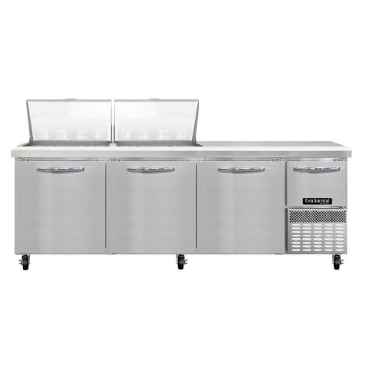 The Continental Refrigerator RA93N24M Refrigerated Base Sandwich Unit is a 93"W unit crafted with a 300 series stainless steel Mighty top and designed to accommodate (24) 1/6 size x 4" deep pans, making it a standout choice for busy commercial kitchens. With its stainless steel front and sides, galvanized steel case back, and an aluminum interior, this unit is built for durability and efficiency. The refrigeration system is powered by a 1/3 HP side-mounted compressor using R290 Hydrocarbon refrigerant, ensuring energy-efficient cooling. The inclusion of a 10" deep nylon cutting board provides a practical surface for food preparation. This model features (3) full and (1) half height field rehingeable doors, offering flexibility and ease of use in any kitchen layout. The electronic control system enhances precision in temperature management, while the off cycle defrost and hot gas condensate evaporator maintain optimal performance and cleanliness. Certified by cETLus and NSF, this refrigerator meets high safety and sanitation standards, making it an excellent investment for restaurants, cafes, and other food service operations that demand reliability and efficiency in their cold storage solutions.