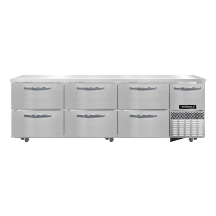 The Continental Refrigerator RA93SN-U-D Undercounter Shallow Depth Refrigerated Base is a meticulously engineered refrigeration unit designed to meet diverse industry needs with precision and efficiency. Measuring 93 inches in width, this refrigerated base features a robust stainless steel construction on the front and end panels, complemented by a stainless steel top. The interior is crafted with aluminum, ensuring durability and optimal thermal efficiency. This unit is equipped with six drawers, each capable of holding a 12 x 20 x 6 pan (supplied by others), and includes one half-height, field-rehingeable door. An advanced electronic control system facilitates efficient operation, complemented by an off-cycle defrost mechanism for energy efficiency. The refrigeration system is front-breathing and side-mounted, utilizing the environmentally friendly R290 hydrocarbon refrigerant. It operates with a 1/4 HP motor, ensuring reliable cooling performance. For mobility and stability, it features twelve 1-3/8 inch diameter plate casters mounted on heavy-duty support plates, which are easily field installed. Certified by cETLus and NSF, the Continental Refrigerator RA93SN-U-D is a versatile solution, offering exceptional performance and adaptability for food service operations that require both undercounter refrigeration and shallow depth configurations.