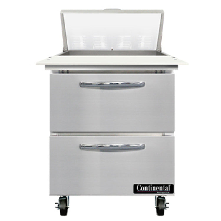 The Continental Refrigerator SW27N8C-D Sandwich Unit is a compact and efficient refrigeration solution, measuring 27 inches wide and boasting a 7.4 cubic feet capacity. This versatile one-section unit features eight 1/6 size pans, each 4 inches deep, complemented by a 19-inch cutting board for food preparation needs. Its two drawers accommodate one 12 x 20 x 6 pan per drawer, although these pans are supplied separately. The unit is constructed with a stainless steel top, front, and end panels, ensuring durability and longevity, while the aluminum back and interior enhance its lightweight nature. The rear-mounted self-contained refrigeration system incorporates an automatic hot gas condensate evaporator and utilizes R290 hydrocarbon refrigerant, aligning with eco-friendly standards. Powered by a 1/5 horsepower motor, this sandwich unit is cETLus and NSF certified, confirming its adherence to safety and sanitation standards. This refrigeration unit is an ideal choice for commercial kitchens seeking a reliable and space-efficient solution to maintain food freshness and organization.