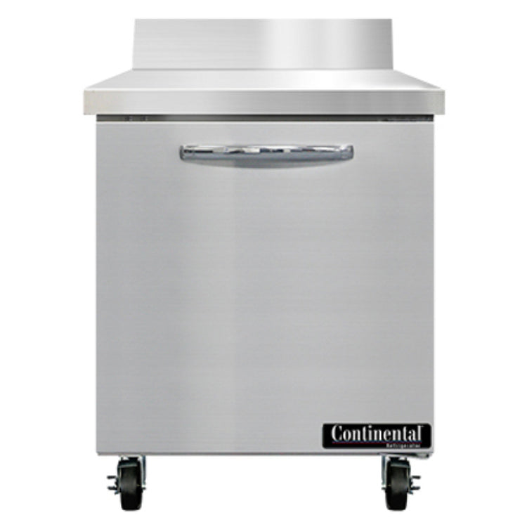 The Continental Refrigerator SW27NBS Work Top Refrigerator is a high-performance unit designed for professional kitchen environments, featuring a 27-inch width and a 7.4 cubic feet capacity, making it suitable for compact spaces while providing sufficient storage. This one-section refrigerator includes a robust stainless steel top with a 5-1/2 inch high backsplash, enhancing durability and maintaining cleanliness. It is equipped with a field rehingeable door for versatile access and installation options. The stainless steel front and end panels ensure durability, while the aluminum interior promotes an optimal storage environment. This refrigerator utilizes a rear-mounted self-contained refrigeration system and employs R290 Hydrocarbon refrigerant, known for its environmentally friendly properties. Operating with a 1/5 horsepower motor, the SW27NBS is both efficient and reliable. It holds cETLus and NSF certifications, ensuring it meets rigorous safety and sanitation standards. Additionally, it is ENERGY STAR® rated, highlighting its energy efficiency and cost-effectiveness. This refrigerator serves various market segments within the food industry, from small cafes to bustling restaurant kitchens, offering reliable refrigeration solutions with a focus on sustainability and space efficiency.