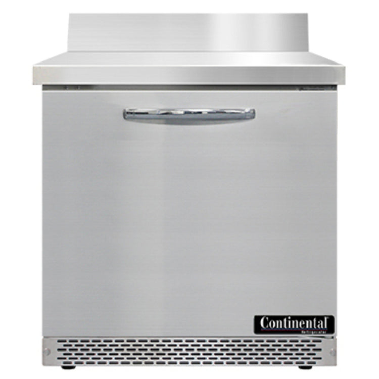 The Continental Refrigerator SW32NBS-FB Work Top Refrigerator - Front Breather 32"W is a high-performance refrigeration solution designed for commercial kitchens and food service establishments. This refrigerator boasts a 9.0 cubic foot capacity within a single-section format, providing ample storage space while maintaining a compact footprint with its 32-inch width. Crafted with a stainless steel top and a 5-1/2-inch high backsplash, it ensures durability and easy cleaning in busy environments. The unit features a field rehingeable door, enhancing versatility and accommodating various kitchen layouts. The stainless steel front and end panels complement its aluminum interior, offering both aesthetic appeal and practical resilience. Equipped with 3-3/4-inch casters, the refrigerator is easily movable, facilitating cleaning and repositioning. The rear-mounted self-contained refrigeration system utilizes R290 Hydrocarbon refrigerant, which is environmentally friendly and efficient, operated by a 1/5 horsepower compressor. Certified by cETLus and NSF, this model meets rigorous safety and sanitation standards, and its ENERGY STARĀ® rating signifies superior energy efficiency. The Continental Refrigerator SW32NBS-FB is ideally suited for cafes, restaurants, and catering services seeking a reliable and sustainable refrigeration solution that seamlessly integrates into their operational workflows.