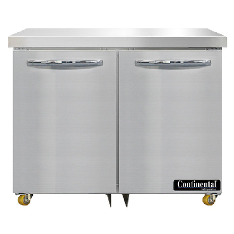 The Continental Refrigerator SW36N-U Undercounter Refrigerator is a highly efficient refrigeration solution specifically designed for space-conscious environments with its compact 36-inch width and generous 10.3 cubic feet capacity. This two-section unit features dual field-rehingeable doors, allowing for flexible door configuration to suit various setups and preferences in commercial kitchens. The exterior boasts a durable stainless steel front, top, and end panels, ensuring long-lasting durability and a sleek appearance. Inside, the aluminum interior offers a robust and hygienic storage solution. The unit is equipped with 1-3/8-inch diameter plate casters, providing smooth mobility and easy repositioning. Its front-breathing design is complemented by a rear-mounted, self-contained refrigeration system utilizing the eco-friendly R290 Hydrocarbon refrigerant, delivering excellent cooling performance with a 1/5 horsepower compressor. Certified by cETLus and recognized with the ENERGY STAR® rating, this undercounter refrigerator meets stringent energy efficiency standards, making it a cost-effective and environmentally conscious choice for professional kitchens. The Continental Refrigerator SW36N-U is ideal for diverse segments within the food service industry, from bustling restaurants to boutique cafes, where space optimization and reliable refrigeration are paramount.
