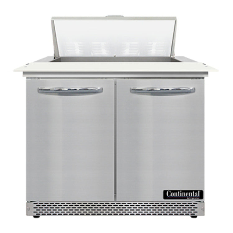 The Continental Refrigerator SW36N8C-FB Sandwich Unit Front Breather 36"W is a meticulously designed refrigeration solution tailored for commercial kitchens and foodservice operations, optimizing both functionality and space. With a width of 36 inches and a substantial capacity of 10.3 cubic feet, this two-section sandwich unit is adept at managing high-demand environments. It features eight 1/6 size x 4" deep pans, accompanied by a 19" cutting board, facilitating efficient preparation and storage. The unit's field rehingeable doors enhance accessibility and flexibility, catering to diverse kitchen layouts. Constructed with a stainless steel top, front, and end panels, it ensures durability and ease of maintenance, while the aluminum back and interior provide a lightweight yet sturdy build. The 3-3/4" casters ensure mobility for seamless kitchen integration. Its self-contained rear-mounted refrigeration system employs an automatic hot gas condensate evaporator, powered by R290 hydrocarbon refrigerant with a 1/5 hp compressor, ensuring energy-efficient cooling performance. Certified by cETLus and NSF, this sandwich unit meets stringent safety and quality standards, making it a reliable choice for restaurants, cafés, and catering services seeking a versatile and robust refrigeration solution.