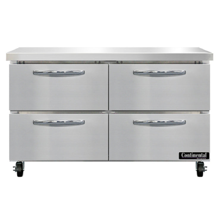 The Continental Refrigerator SW48N-D Work Top Refrigerator - 48"W - 13.4 Cu Ft Capacity is an advanced cooling solution designed to meet the demands of various segment markets within the food service industry. This two-section refrigeration unit features a spacious stainless steel flat top, providing an ideal surface for both food preparation and storage. With its four drawers, it accommodates flexible pan configurations, including one 12 x 18 x 6 pan per drawer or a combination of one 1/2 x 6 pan and one 1/3 x 6 pans per drawer, making it highly adaptable to different kitchen needs. The robust stainless steel front and end panels ensure durability and longevity, while the aluminum interior maintains a lightweight structure. Equipped with a rear-mounted, self-contained refrigeration system utilizing R290 Hydrocarbon refrigerant, this unit ensures eco-friendly and efficient cooling. With a 1/5 hp motor, it delivers reliable performance, and its compliance with cETLus and NSF standards guarantees adherence to safety and quality benchmarks. The Continental Refrigerator SW48N-D is an invaluable asset across professional kitchen environments, combining practical features with advanced refrigeration technology to enhance operational efficiency and food safety.