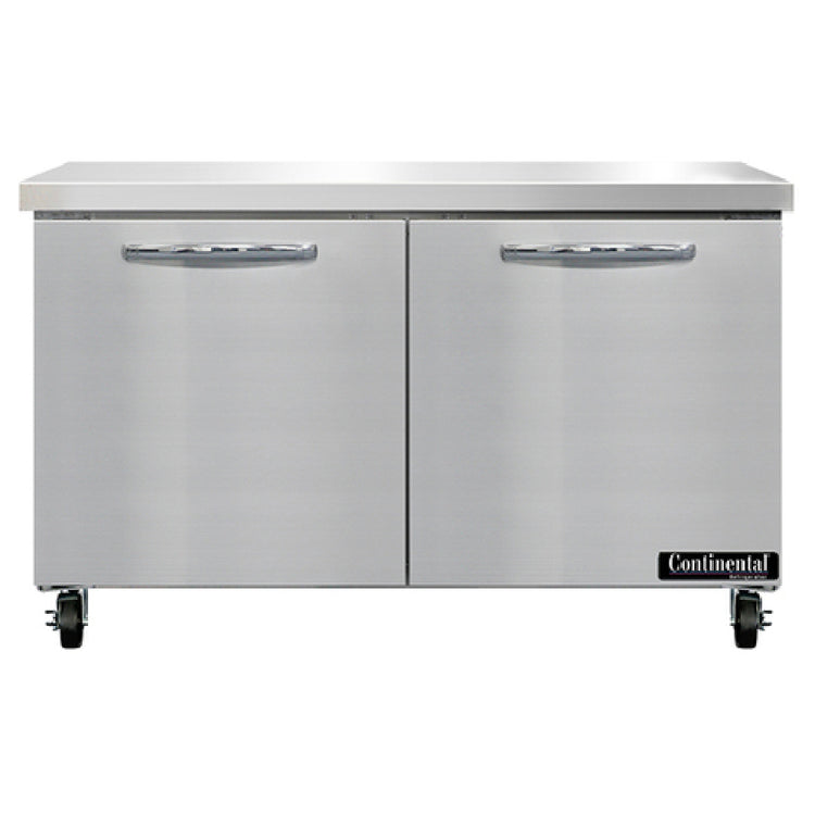 The Continental Refrigerator SW48N Work Top Refrigerator is a versatile appliance designed for professional kitchens, providing efficient cold storage with a 48-inch width and a substantial 13.4 cubic feet capacity. This two-section refrigerator features a stainless steel flat top, enhancing its durability and providing additional workspace. Each of its two field-rehingeable doors offers the flexibility needed for easy access and placement in varying kitchen layouts. Constructed with a stainless steel front and end panels, it ensures a long-lasting, professional appearance while the aluminum interior facilitates easy cleaning and maintenance. The rear-mounted, self-contained refrigeration system utilizes the environmentally friendly R290 Hydrocarbon refrigerant, powered by a 1/5 horsepower compressor, ensuring efficient cooling and energy savings. This refrigerator is cETLus and NSF certified, meeting North American safety and sanitation standards, and it is ENERGY STAR-rated, which underscores its energy efficiency. The Continental Refrigerator SW48N is ideal for food service establishments seeking a reliable and robust refrigeration solution that combines functionality with environmental consciousness, making it a prudent choice for diverse segments within the food service industry.