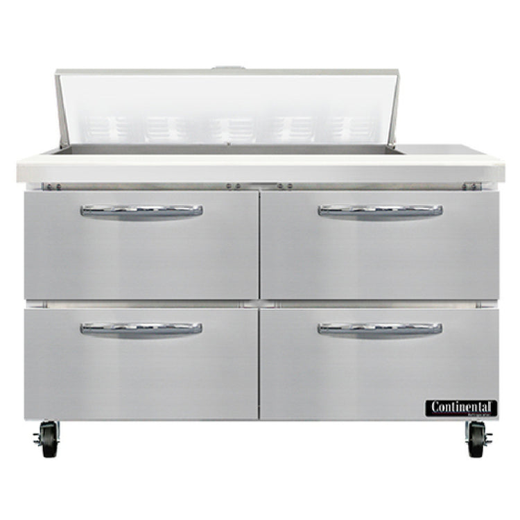 The Continental Refrigerator SW48N10-D Sandwich Unit is a versatile refrigeration solution with a width of 48 inches and a storage capacity of 13.4 cubic feet, making it ideal for busy commercial kitchens and sandwich shops. This two-section unit features ten 1/6 size pans, each 4 inches deep, and comes equipped with a convenient 12-inch cutting board, optimizing food preparation efficiency. The unit incorporates four drawers, each capable of accommodating a pan configuration of either one 12 x 18 x 6 pan or a combination of one 1/2 x 6 pan and one 1/3 x 6 pan, although pans are supplied by others. The robust construction includes a stainless steel top, front, and end panels, while the back and interior are crafted from durable aluminum, ensuring longevity and ease of cleaning. The rear-mounted self-contained refrigeration utilizes R290 hydrocarbon refrigerant, supported by a 1/4 horsepower compressor, ensuring energy efficiency and compliance with environmental standards. It also features an automatic hot gas condensate evaporator, enhancing its performance. Certified by cETLus and NSF, this sandwich unit meets rigorous standards for safety and sanitation. The Continental Refrigerator SW48N10-D is engineered to deliver reliable refrigeration performance tailored to the demands of the foodservice industry.