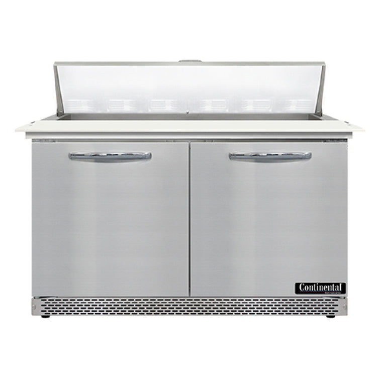 The Continental Refrigerator SW48N12C-FB Sandwich Unit Front Breather 48"W is a versatile refrigeration solution, ideal for various food service operations. With a spacious 13.4 cubic feet capacity, this two-section unit is designed to enhance efficiency in any fast-paced kitchen environment. It features (12) 1/6 size x 4" deep pans, providing ample space for ingredient storage, along with a convenient 19" cutting board for seamless food preparation. The unit is engineered with two field rehingeable doors, allowing for flexible access and configuration. Constructed with a stainless steel top, front, and end panels, it ensures durability and a sleek appearance, while the aluminum back and interior contribute to robust performance. Equipped with 3-3/4" casters, the unit is easily maneuverable for cleaning and positioning. The rear-mounted self-contained refrigeration system employs an automatic hot gas condensate evaporator, utilizing R290 hydrocarbon refrigerant for efficient and eco-friendly cooling. Powered by a 1/4 hp compressor, this unit meets cETLus and NSF standards, affirming its quality and safety for commercial use. The Continental Refrigerator SW48N12C-FB is a reliable and efficient choice for businesses seeking a robust, high-capacity sandwich unit that prioritizes both function and form.