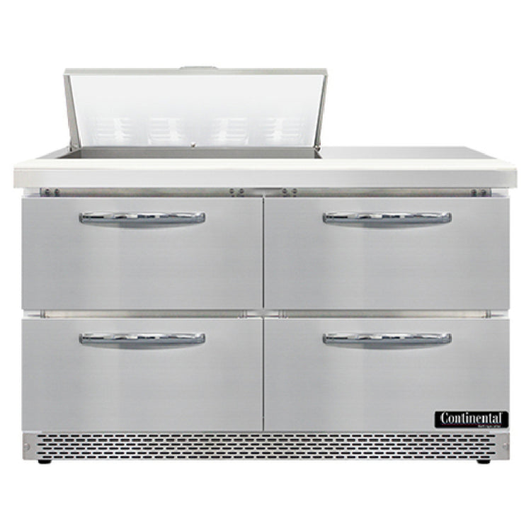 The Continental Refrigerator SW48N8-FB-D Sandwich Unit - Front Breather - 48" W is meticulously designed for commercial kitchens, offering a reliable and efficient solution for food preparation and storage. This two-section unit is equipped with (8) 1/6 size x 4" deep pans and a 12" cutting board, providing ample space and convenience for sandwich making. Featuring (4) drawers, each capable of accommodating (1) 12 x 18 x 6 pan or a combination of (1) 1/2 x 6 pan & (1) 1/3 x 6 pans, this unit maximizes storage versatility. The robust stainless steel construction for the top, front, and end panels ensures durability and longevity, while the aluminum back and interior add to its lightweight yet sturdy design. The 3-3/4" casters allow for easy mobility, making it adaptable to various kitchen layouts. With a rear-mounted self-contained refrigeration system, automatic hot gas condensate evaporator, and R290 hydrocarbon refrigerant, it ensures consistent cooling performance with a 1/4 hp compressor. Certified by cETLus and NSF, this sandwich unit meets high standards of safety and sanitation, making it an indispensable asset for delis, cafes, and any foodservice establishment seeking efficiency and reliability in their operations.