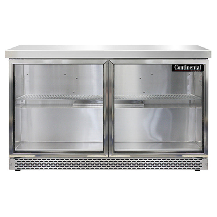 The Continental Refrigerator SW48NGD-FB Work Top Display Refrigerator is a versatile piece of equipment designed for commercial environments requiring efficient refrigeration and display solutions. With a substantial 13.4 cubic feet capacity, this two-section unit is ideal for showcasing and storing a variety of perishable items. The refrigerator features a 48-inch width and incorporates a durable stainless steel flat top, maximizing usability in busy kitchen settings. It is equipped with two glass doors, allowing for clear visibility of contents while enhancing the aesthetic appeal of the unit. The LED interior lighting ensures optimal illumination, making it easier to organize and access stored items. The refrigerator is constructed with stainless steel front and end panels, combined with an aluminum interior for durability and ease of cleaning. Mounted on 3-3/4 inch casters, it offers mobility for flexible positioning. The rear-mounted self-contained refrigeration system employs R290 Hydrocarbon refrigerant, notable for its eco-friendliness and energy efficiency. With a 1/5 horsepower compressor, this unit is cETLus and NSF certified, underscoring its compliance with safety and sanitation standards. The front-breathing design is particularly advantageous for installations where space is a premium, providing a reliable refrigeration solution for diverse commercial applications.
