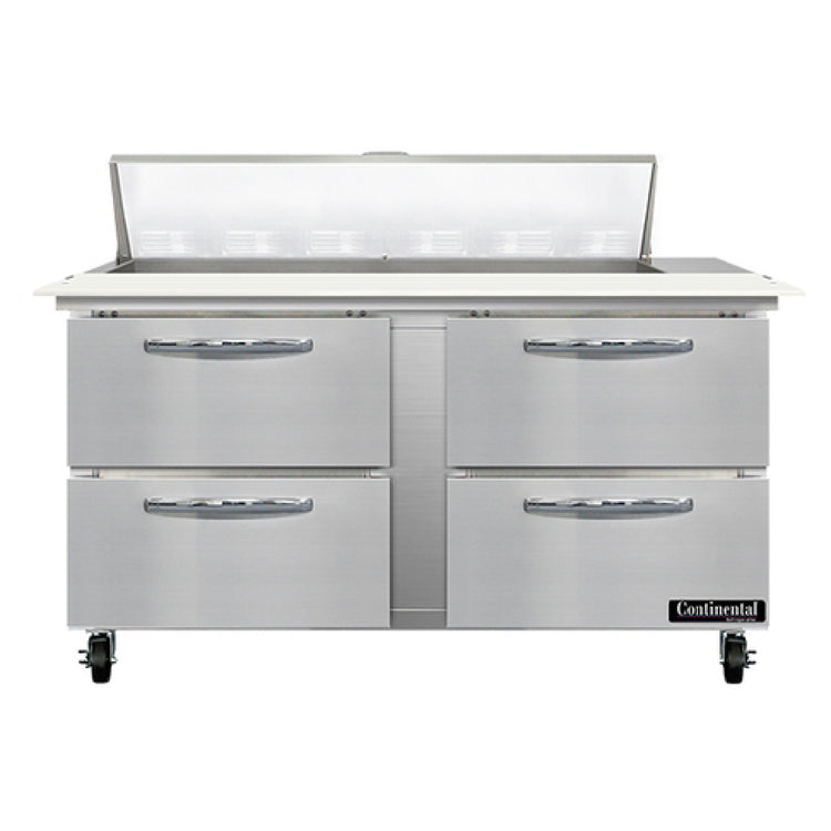 The Continental Refrigerator SW60N12C-D Sandwich Unit is a state-of-the-art refrigeration solution measuring 60 inches in width, boasting a generous capacity of 17.0 cubic feet. This versatile two-section unit is equipped with twelve 1/6 size, 4-inch deep pans, complemented by a 19-inch cutting board, providing ample preparation space. It features four robust drawers, each capable of accommodating one 12 x 20 x 6 pan, which must be supplied separately by the user. Constructed with a durable stainless steel top, front, and end panels, the unit is designed for longevity and resistance to wear, with an aluminum back and interior for added durability. The rear-mounted, self-contained refrigeration system utilizes R290 hydrocarbon refrigerant, powered by a 1/3 horsepower compressor, ensuring efficient and environmentally friendly cooling. An automatic hot gas condensate evaporator further enhances functionality by minimizing maintenance needs. The SW60N12C-D is cETLus and NSF certified, meeting stringent standards for safety and sanitation, making it an ideal choice for restaurants, cafeterias, and other food service establishments seeking reliable, high-capacity refrigeration that supports both preparation and storage needs effectively.