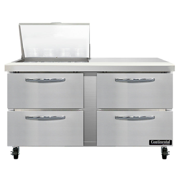 The Continental Refrigerator SW60N12M-D Mighty Top Sandwich Unit is a highly efficient and versatile refrigeration solution designed to meet the demanding needs of the food service industry. With a 60-inch width and a generous 17.0 cubic feet capacity, this two-section unit is engineered for optimal storage and accessibility. It features twelve 1/6 size pans, each 4 inches deep, complemented by an 8-inch cutting board for efficient food preparation. The unit includes four drawers, each capable of accommodating a 12 x 20 x 6 pan, though these pans are supplied separately. Constructed with a stainless steel top, front, and end panels, and an aluminum back and interior, this sandwich unit balances durability and practicality. The rear-mounted self-contained refrigeration system ensures consistent cooling, utilizing an automatic hot gas condensate evaporator and R290 hydrocarbon refrigerant, powered by a 1/3 horsepower compressor. Certified by cETLus and NSF, the SW60N12M-D underscores its compliance with industry standards and commitment to safe and sustainable operations. Its design caters to a variety of markets, from bustling urban delis to large-scale catering events, providing a reliable and efficient solution for maintaining the quality of perishable ingredients.