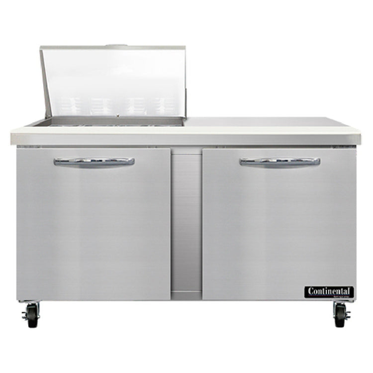 The Continental Refrigerator SW60N12M Mighty Top Sandwich Unit - 60"W, 17.0 Cu Ft Capacity is a versatile refrigeration solution designed for the rigorous demands of commercial kitchens, especially those specializing in sandwich and salad preparation. This robust unit features a two-section design with a spacious interior, capable of accommodating (12) 1/6 size pans at a depth of 4 inches. Complementing its storage capacity, the unit integrates an 8-inch cutting board, providing a practical workspace for efficient food preparation. Its stainless steel top, front, and end panels ensure durability and ease of maintenance, while the aluminum back and interior enhance its overall longevity. The unit is equipped with (2) field rehingeable doors, offering flexibility in door configuration to fit various kitchen layouts. The rear-mounted self-contained refrigeration system utilizes the eco-friendly R290 hydrocarbon refrigerant, ensuring optimal cooling performance with a reduced environmental footprint. The automatic hot gas condensate evaporator further enhances the unit's efficiency and reliability. With a 1/3 HP compressor, this sandwich unit meets both cETLus and NSF standards, catering to a range of foodservice operations that prioritize quality and sustainability in their refrigeration equipment. Such features make it a suitable choice for restaurants, cafes, and catering businesses.
