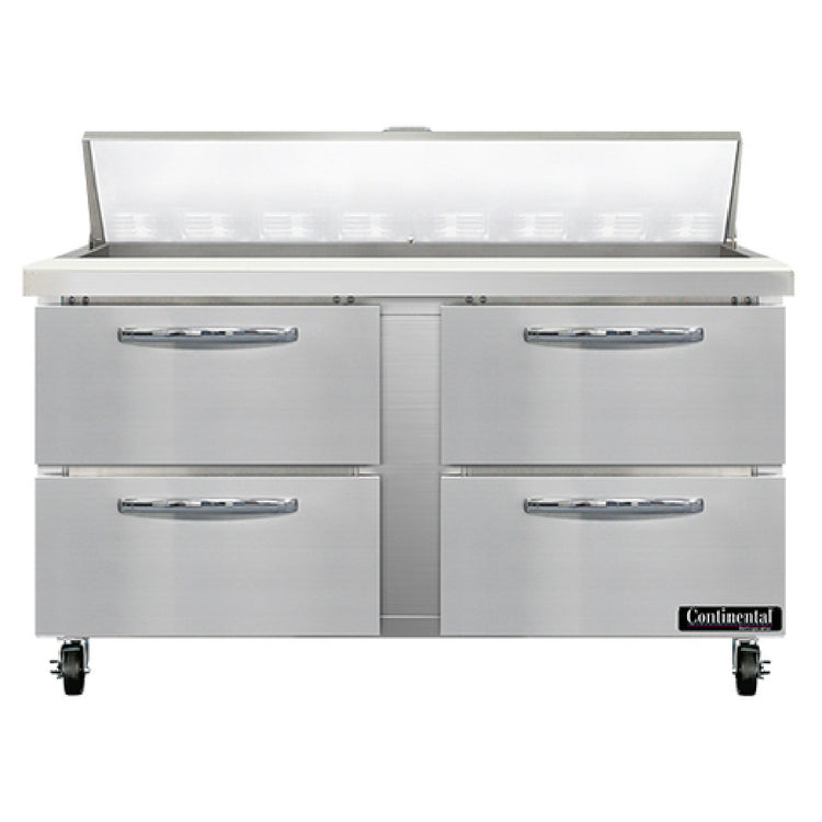 The Continental Refrigerator SW60N16-D Sandwich Unit is a premium refrigeration solution designed for efficient food preparation and storage. With a substantial 60"W two-section design, it offers a notable 17.0 cu ft capacity, catering to the needs of busy kitchens and food service establishments. This unit is equipped with (16) 1/6 size x 4" deep pans, accompanied by a convenient 12" cutting board, making it an ideal choice for sandwich preparation stations. It features (4) drawers, each capable of accommodating one 12 x 20 x 6 pan, which must be supplied by others. Constructed with a stainless steel top, front, and end panels, alongside an aluminum back and interior, the unit ensures durability and a professional appearance. The rear-mounted self-contained refrigeration system features an automatic hot gas condensate evaporator and utilizes R290 hydrocarbon refrigerant, promoting energy efficiency and environmental sustainability. Powered by a 1/3 HP compressor, this unit complies with cETLus and NSF standards, ensuring it meets safety and sanitation requirements. The SW60N16-D Sandwich Unit is a versatile and reliable asset for various segment markets within the food industry, from restaurants and delis to catering services, emphasizing its robust build and user-friendly features.