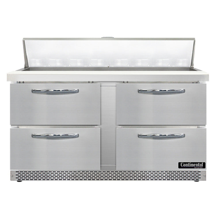The Continental Refrigerator SW60N16-FB-D Sandwich Unit is an exceptional refrigeration solution, engineered for efficiency and versatility in commercial kitchens. This front-breathing unit, measuring 60 inches wide, boasts a 17.0 cubic foot capacity, perfect for high-demand environments. Designed with two sections, it accommodates 16 pans of 1/6 size and 4 inches deep, paired with a 12-inch cutting board for extensive prep space. Its four drawers are adept at holding one 12 x 20 x 6 pan per drawer, though these pans are supplied by others. The construction includes a stainless steel top, front, and end panels, with an aluminum back and interior, contributing to its robust durability. The unit is mounted on 3-3/4 inch casters for easy maneuverability. The rear-mounted self-contained refrigeration uses R290 hydrocarbon refrigerant and features an automatic hot gas condensate evaporator, powered by a 1/3 HP compressor. This design ensures efficient cooling and environmental sustainability. The SW60N16-FB-D is cETLus and NSF certified, ensuring compliance with safety and sanitation standards, making it an ideal choice for restaurant chains, catering services, and institutional food service settings that demand reliability and efficiency in food preparation and storage.