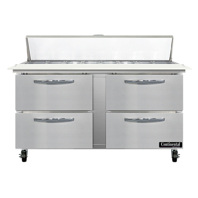The Continental Refrigerator SW60N16C-D Sandwich Unit is a 60"W two-section unit with a 17.0 cu ft capacity, making it an efficient choice for commercial kitchens and food service operations. This versatile unit comes equipped with (16) 1/6 size x 4" deep pans, providing ample space for ingredients, along with a 19" cutting board for seamless preparation. It features (4) drawers, each designed to accommodate (1) 12 x 20 x 6 pan, allowing for flexible storage options. The exterior is crafted from durable stainless steel, with the top, front, and end panels ensuring a sleek and professional appearance, while the aluminum back and interior contribute to its lightweight design. The rear-mounted self-contained refrigeration system utilizes R290 hydrocarbon refrigerant and a 1/3 HP motor, offering efficient cooling capabilities. The automatic hot gas condensate evaporator further enhances this unit's performance by reducing maintenance requirements. Certified by cETLus and NSF, the Continental Refrigerator SW60N16C-D adheres to stringent safety and sanitation standards, making it a reliable choice for different market segments within the food industry. Its combination of robust construction and high capacity storage make it a valuable asset for establishments seeking to optimize their operational efficiency.