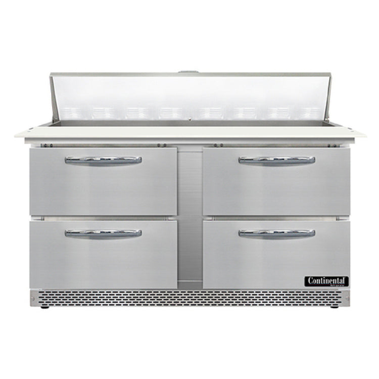 The Continental Refrigerator SW60N16C-FB-D Sandwich Unit Front Breather 60"W stands out in the realm of commercial refrigeration with its efficient design and robust capabilities. This two-section unit offers a generous 17.0 cu ft capacity, making it suitable for diverse food service environments. It includes sixteen 1/6 size x 4" deep pans accompanied by a 19" cutting board, optimizing preparation space. The unit is equipped with four drawers, each capable of accommodating a 12 x 20 x 6 pan, which must be supplied separately. The exterior features a stainless steel top, front, and end panels, complemented by an aluminum back and interior, ensuring durability and ease of maintenance. Mounted on 3-3/4" casters, this sandwich unit is designed for easy mobility within any kitchen setting. The rear-mounted, self-contained refrigeration system uses R290 hydrocarbon refrigerant, powered by a 1/3 HP compressor, ensuring energy efficiency and environmental friendliness. Additionally, the automatic hot gas condensate evaporator enhances operational efficiency. This product is cETLus and NSF certified, assuring adherence to safety and sanitation standards. Overall, the Continental Refrigerator SW60N16C-FB-D is a reliable choice for professional kitchens requiring a combination of ample storage, durability, and innovative refrigeration technology.