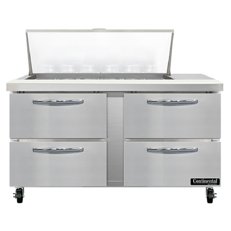 The Continental Refrigerator SW60N18M-D Mighty Top Sandwich Unit is a highly functional and versatile addition to any commercial kitchen. With a substantial 60"W and 17.0 cu ft capacity, this two-section unit is designed to handle the demands of busy food service environments. It features (18) 1/6 size x 4" deep pans and comes with an 8" cutting board, providing ample space and convenience for sandwich preparation. The unit is equipped with (4) drawers, each capable of accommodating (1) 12 x 20 x 6 pan, allowing for efficient storage and organization of ingredients. Constructed with a stainless steel top, front, and end panels, along with an aluminum back and interior, the Mighty Top Sandwich Unit ensures durability and ease of maintenance. The rear-mounted self-contained refrigeration system utilizes R290 hydrocarbon refrigerant and features an automatic hot gas condensate evaporator, powered by a 1/3 HP motor, ensuring optimal performance and energy efficiency. Certified by cETLus and NSF, this unit meets stringent safety and sanitation standards, making it a reliable choice for various market segments within the food service industry, from delis to restaurants and catering businesses.