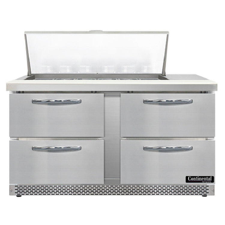 The Continental Refrigerator SW60N18M-FB-D Mighty Top Sandwich Unit - Front Breather is a highly efficient refrigeration solution designed for dynamic commercial kitchen environments. Measuring 60 inches in width, this two-section unit boasts a substantial 17.0 cubic feet capacity, making it ideal for high-volume operations. It includes an 18-pan configuration with each pan measuring 1/6 size and 4 inches deep, alongside an 8-inch cutting board for efficient food preparation. The unit features four drawers, each accommodating a 12 x 20 x 6 pan, which must be provided by users. Constructed with a durable stainless steel top and front and end panels, complemented by an aluminum back and interior, it ensures longevity and ease of cleaning. Equipped with 3-3/4 inch casters, the unit is easily maneuverable. Its rear-mounted self-contained refrigeration system employs R290 hydrocarbon refrigerant and a 1/3 HP compressor, ensuring eco-friendly and efficient cooling performance. An automatic hot gas condensate evaporator enhances its operational efficiency. Certified by cETLus and NSF, the SW60N18M-FB-D epitomizes sanitary standards and safety, making it a reliable choice for restaurants, sandwich shops, and catering businesses seeking a robust and versatile refrigeration unit.