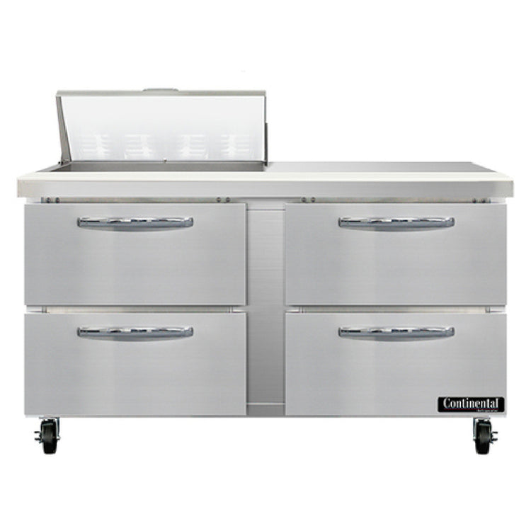 The Continental Refrigerator SW60N8-D Sandwich Unit is a versatile solution for commercial food service establishments, boasting a 60-inch width and a generous 17.0 cubic feet capacity. This two-section unit is equipped with eight 1/6 size pans, each 4 inches deep, complemented by a 12-inch cutting board, making it ideal for sandwich preparation. The unit features four drawers, designed to accommodate one 12 x 20 x 6 pan per drawer, though pans are supplied by others. The durable construction includes a stainless steel top, front, and end panels, with an aluminum back and interior for added durability. The rear-mounted self-contained refrigeration system ensures efficient operation, utilizing R290 hydrocarbon refrigerant and a 1/3 HP compressor. An automatic hot gas condensate evaporator enhances the unit's performance, contributing to its seamless operation. Certified by cETLus and NSF, this sandwich unit meets rigorous safety and sanitation standards. The Continental Refrigerator SW60N8-D is a reliable and efficient choice for restaurants, cafes, and delis, looking to streamline their sandwich preparation processes while maintaining high standards of quality and performance.