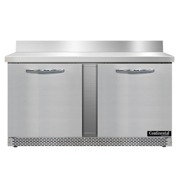 The Continental Refrigerator SW60NBS-FB Work Top Refrigerator - Front Breather 60"W is a versatile and durable refrigeration solution designed for commercial kitchens and food service environments. With a spacious 17.0 cubic feet capacity, this two-section refrigerator features a stainless steel top equipped with a 5-1/2" high backsplash, providing a practical work surface while enhancing cleanliness. The unit includes two field rehingeable doors, allowing for flexible installation to suit various kitchen layouts. Its robust construction is evident in the stainless steel front and end panels, paired with an aluminum interior, ensuring longevity and ease of maintenance. Mobility is facilitated by 3-3/4" casters, making it easy to reposition within busy commercial spaces. The rear-mounted, self-contained refrigeration system utilizes R290 Hydrocarbon refrigerant, powered by a 1/5 HP compressor, contributing to its ENERGY STAR® certification for energy efficiency. Compliance with cETLus and NSF standards further attests to its safety and quality in a professional setting. The Continental Refrigerator SW60NBS-FB is aimed at catering to diverse industry segments, from restaurants to catering businesses, by offering a reliable and efficient refrigeration option that meets rigorous commercial demands.