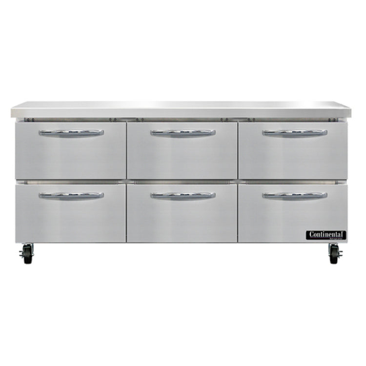 The Continental Refrigerator SW72N-D Work Top Refrigerator 72"W 20.6 Cu Ft Capacity is a versatile refrigeration solution tailored for the needs of commercial kitchens. With a substantial capacity of 20.6 cubic feet, this three-section refrigerator is designed to optimize storage and efficiency. The stainless steel flat top serves a dual purpose, providing a durable work surface that is easy to clean, while the stainless steel front and end panels ensure robustness and longevity. Inside, the aluminum interior reflects the refrigerator’s commitment to sturdiness and hygiene. This model features six drawers, each accommodating one 12 x 18 x 6 pan per drawer or a combination of one 1/2 x 6 and one 1/3 x 6 pans, allowing for flexible storage solutions depending on the kitchen’s requirements. The SW72N-D is equipped with rear-mounted self-contained refrigeration, utilizing R290 Hydrocarbon refrigerant for efficient and environmentally friendly cooling. Powered by a 1/5 HP motor, this refrigerator delivers reliable performance. It is certified by cETLus and NSF, ensuring compliance with safety and sanitation standards. The Continental Refrigerator SW72N-D is an ideal choice for food establishments seeking a combination of spacious storage, efficient design, and durable construction in their refrigeration units.