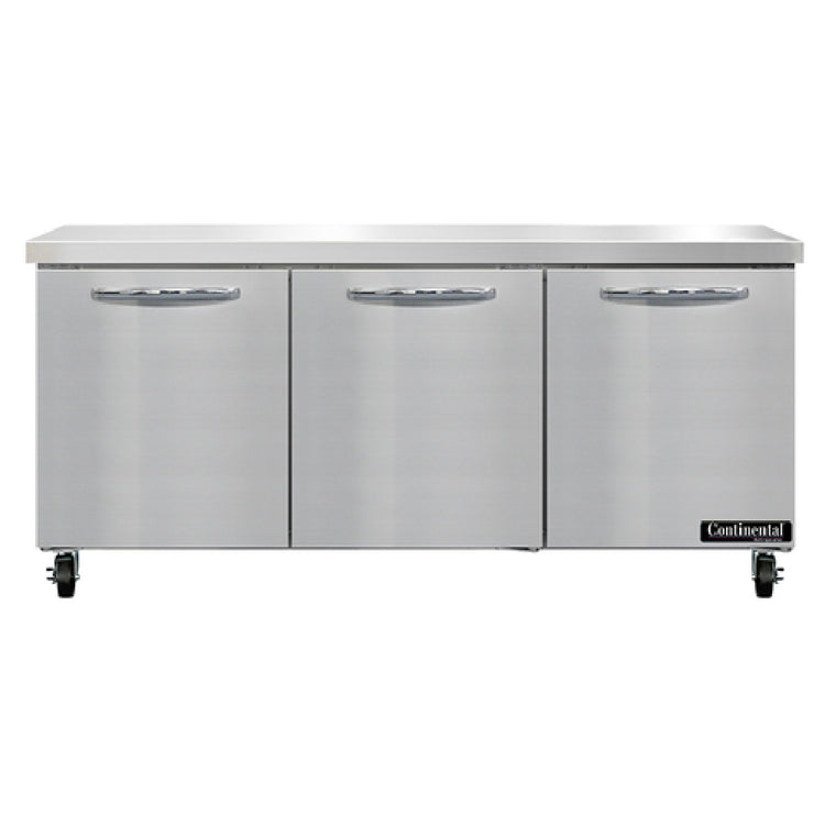 The Continental Refrigerator SW72N Work Top Refrigerator - 72"W - 20.6 Cu Ft Capacity is a versatile and efficient refrigeration solution for commercial kitchens requiring ample storage space. This three-section unit is designed with a stainless steel flat top, providing a durable and smooth surface for additional workspace. The refrigerator features three field-rehingeable doors, allowing for flexible installation to suit various kitchen layouts. Its front and end panels are constructed from stainless steel for enhanced durability, while the interior is crafted from aluminum, ensuring an optimal blend of strength and lightweight design. It employs rear-mounted self-contained refrigeration, using R290 Hydrocarbon refrigerant, an environmentally friendly option. Powered by a 1/5 horsepower motor, this unit ensures reliable cooling performance. The SW72N is both cETLus and NSF certified, meeting stringent safety and sanitation standards, and it is ENERGY STAR® rated for its energy-efficient operation. This combination of features makes the Continental Refrigerator SW72N a valuable asset for food service establishments seeking reliable refrigeration with a spacious capacity, ensuring that it caters to diverse industry requirements such as restaurants, catering services, and institutional kitchens looking for efficiency and durability in their refrigeration needs.