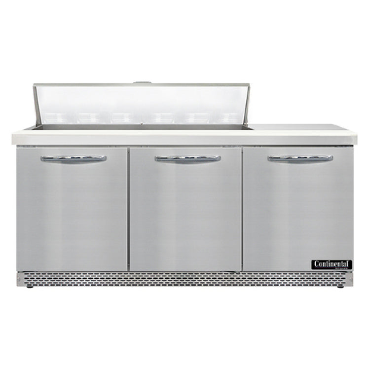The Continental Refrigerator SW72N12-FB Sandwich Unit - Front Breather - 72"W is a high-capacity refrigeration solution designed for commercial foodservice environments. With a 20.6 cubic feet capacity, this three-section unit is engineered to accommodate various cooling needs efficiently. It features twelve 1/6 size by 4" deep pans, complemented by a 12" cutting board, making it perfect for sandwich preparation. The unit is equipped with three field rehingeable doors, which allow for flexible access and configuration. The robust stainless steel top, front, and end panels ensure durability, while the aluminum back and interior provide lightweight efficiency. Maneuverability is enhanced through 3-3/4" casters, making repositioning effortless. This unit utilizes a rear-mounted self-contained refrigeration system, powered by a 1/3 HP motor, and employs R290 hydrocarbon refrigerant, known for its environmentally friendly properties. An automatic hot gas condensate evaporator ensures optimal performance and maintenance. Certified by cETLus and NSF, this sandwich unit meets rigorous safety and sanitation standards. The Continental Refrigerator SW72N12-FB Sandwich Unit is ideal for delis, cafes, and restaurants seeking a reliable and spacious refrigeration solution that combines cutting-edge technology with practical design elements.