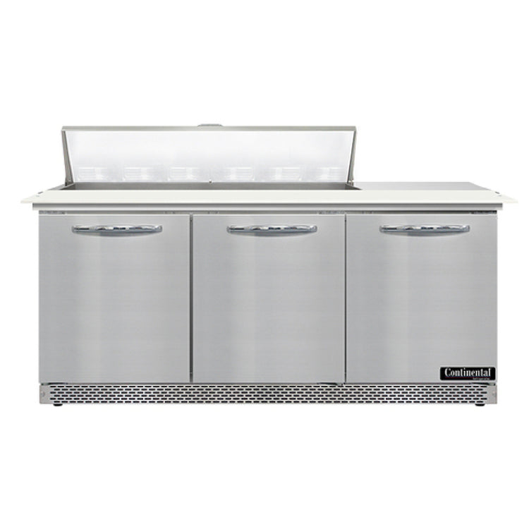 The Continental Refrigerator SW72N12C-FB Sandwich Unit Front Breather 72"W is a versatile and efficient solution designed for commercial kitchens requiring ample preparation and storage space. With a substantial 20.6 cubic feet capacity, this three-section unit accommodates (12) 1/6 size x 4" deep pans, complemented by a 19" cutting board for seamless sandwich preparation. Each of the three doors is field rehingeable, enhancing the unit’s adaptability in varying kitchen layouts. The stainless steel top, front, and end panels, combined with an aluminum back and interior, ensure durability and ease of cleaning. Mobility is facilitated by 3-3/4" casters, while a rear-mounted self-contained refrigeration system utilizing R290 hydrocarbon refrigerant maintains energy efficiency. The automatic hot gas condensate evaporator adds to the trouble-free operation of the unit. Powered by a 1/3 HP motor, it meets cETLus and NSF standards, guaranteeing safety and quality in food preparation environments. This refrigerator’s design makes it particularly suitable for delis, sandwich shops, and high-volume kitchens where reliability and convenience are essential.