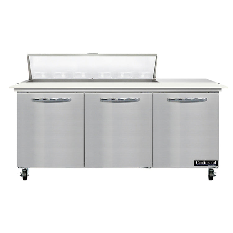 The Continental Refrigerator SW72N12C Sandwich Unit - 72"W - 20.6 Cu Ft Capacity is a highly efficient refrigeration solution designed for large-scale food service operations. This three-section unit provides ample storage with a capacity of 20.6 cubic feet, accommodating (12) 1/6 size x 4" deep pans, complemented by a 19" cutting board for efficient preparation. Its design includes three field rehingeable doors, allowing customizable access based on kitchen layout requirements. The exterior is constructed with a stainless steel top, front, and end panels, ensuring durability and aesthetic appeal, while the aluminum back and interior provide a lightweight and easy-to-clean surface. The rear-mounted self-contained refrigeration system utilizes an automatic hot gas condensate evaporator, enhancing operational efficiency and reducing maintenance needs. It employs an eco-friendly R290 hydrocarbon refrigerant, aligned with modern sustainability standards. Powered by a 1/3 HP compressor, the unit ensures reliable cooling performance. Certified by cETLus and NSF, the SW72N12C meets rigorous safety and sanitation standards, making it a trusted choice for professional kitchens, delis, and sandwich shops aiming for excellence in food storage and preparation. Its thoughtful engineering and robust construction make it an indispensable asset in high-demand culinary environments.