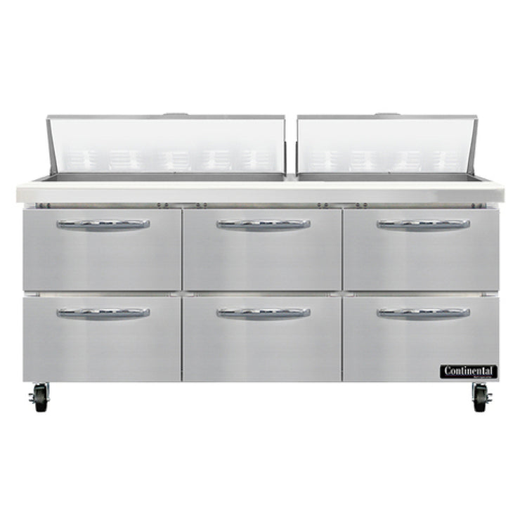 The Continental Refrigerator SW72N18-D Sandwich Unit is a highly efficient unit designed for commercial kitchen environments, measuring 72 inches in width and boasting a generous capacity of 20.6 cubic feet. This three-section sandwich unit is equipped with eighteen 1/6 size, 4-inch deep pans, complemented by a 12-inch cutting board, making it an ideal choice for food preparation. The unit features six drawers, each capable of accommodating either one 12 x 18 x 6 pan or a combination of one 1/2 x 6 and one 1/3 x 6 pans, although these pans are supplied separately. Constructed with a stainless steel top, front, and end panels, and an aluminum back and interior, this sandwich unit ensures durability and longevity. The rear-mounted, self-contained refrigeration system features an automatic hot gas condensate evaporator, utilizing R290 hydrocarbon refrigerant and powered by a 1/3 HP motor. The Continental Refrigerator SW72N18-D is cETLus and NSF certified, affirming its compliance with stringent safety and sanitation standards, making it a reliable choice for restaurants, delis, and cafes seeking efficient and durable sandwich preparation solutions.