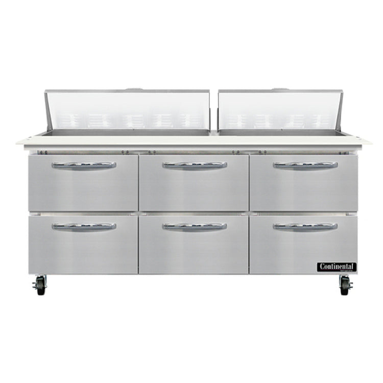 The Continental Refrigerator SW72N18C-D Sandwich Unit is an expertly designed refrigeration solution with a 20.6 cubic foot capacity, perfect for commercial food service environments. Measuring 72 inches in width, this three-section unit is equipped with 18 pans of 1/6 size and 4 inches in depth, complemented by a 19-inch cutting board for efficient food preparation. It includes six drawers, each capable of accommodating one 12 x 18 x 6 pan or a combination of one 1/2 x 6 and one 1/3 x 6 pans, enhancing its versatility for various culinary needs. The unit is constructed with a stainless steel top, front, and end panels, while the back and interior are crafted from durable aluminum. Its rear-mounted, self-contained refrigeration system includes an automatic hot gas condensate evaporator and utilizes R290 hydrocarbon refrigerant, driven by a 1/3 HP compressor. Certified by cETLus and NSF, this sandwich unit meets rigorous safety and performance standards, making it an ideal choice for restaurants, delis, and catering services that demand reliable refrigeration and efficient food storage solutions. The thoughtful design and robust materials ensure longevity and ease of use, providing a high-performance refrigeration option for professionals in the food industry.