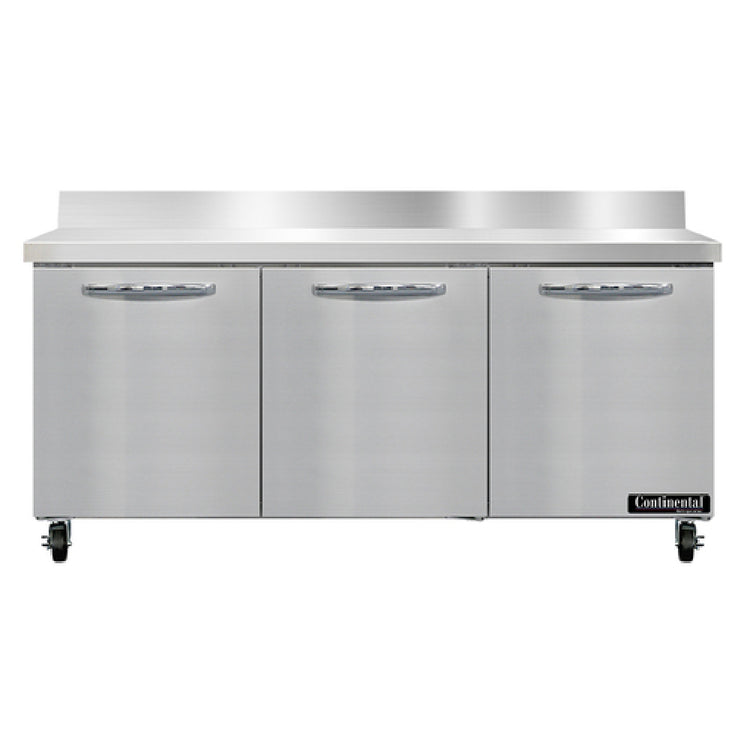 The Continental Refrigerator SW72NBS Work Top Refrigerator - 72"W - 20.6 Cu Ft Capacity is a high-performance refrigeration solution designed for commercial kitchens requiring ample storage and efficient cooling. This model features a spacious 20.6 cubic feet capacity, divided into three sections, each accessible through independent field rehingeable doors, allowing for customizable door configurations to suit various kitchen layouts. The unit is topped with a durable stainless steel work surface complemented by a 5-1/2" backsplash, providing additional workspace while protecting walls from spills and splashes. Constructed with a stainless steel front and end panels, this refrigerator combines durability with a sleek, professional appearance, while the aluminum interior ensures easy cleaning and maintenance. The rear-mounted self-contained refrigeration system utilizes R290 Hydrocarbon refrigerant, an environmentally friendly option that provides reliable cooling with a 1/5 HP compressor. Certified by cETLus and NSF, this unit meets stringent safety and sanitation standards, and its ENERGY STAR® rating underscores its energy efficiency, making it a cost-effective choice for businesses aiming to reduce operational expenses. The Continental Refrigerator SW72NBS is a versatile and dependable refrigeration unit, ideal for various segments of the foodservice industry, including restaurants, catering services, and institutional kitchens.