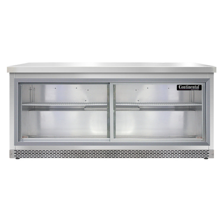 The Continental Refrigerator SW72NSGD-FB Work Top Display Refrigerator Front Breather is a versatile refrigeration unit tailored for various commercial segments, particularly in retail and food service industries. Measuring 72 inches in width, this refrigerator offers a substantial 20.6 cubic feet capacity, efficiently organized across three sections, making it suitable for businesses that require ample storage and display solutions. It features two sliding glass doors that provide easy access while showcasing stored contents with the aid of energy-efficient LED interior lighting. The unit's robust construction includes a stainless steel front and end panels, complemented by an aluminum interior, ensuring durability and easy maintenance. Equipped with rear mounted self-contained refrigeration, it utilizes R290 Hydrocarbon refrigerant, a more environmentally friendly option that aligns with modern sustainability standards. The refrigerator operates with a 1/4 HP motor and is cETLus and NSF certified, confirming its adherence to safety and sanitation requirements. Designed with convenience in mind, it sits on 3-3/4 inch casters, facilitating easy mobility and placement within workspaces. The front breather design enhances operational efficiency by allowing placement in tight spaces, optimizing your valuable floor space. This unit is a practical solution for businesses seeking efficient refrigeration combined with a sleek display feature.