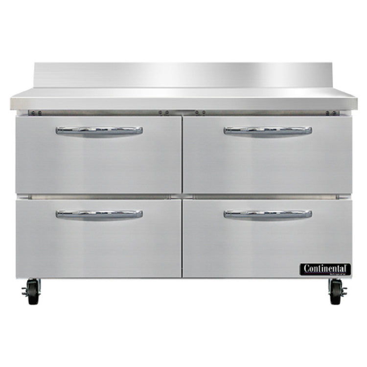 The Continental Refrigerator SWF48NBS-D Work Top Freezer is a versatile two-section unit with a 48"W design and a generous 13.4 cu ft capacity, perfect for commercial kitchens that require efficient space utilization. Its stainless steel top is equipped with a 5-1/2"H backsplash, providing durability and ease of cleaning. This work top freezer features four drawers, each capable of accommodating one 12 x 18 x 6 pan or one 1/2 x 6 pan and one 1/3 x 6 pan, offering flexibility for various storage needs. The stainless steel front and end panels add to its robust construction, while the aluminum interior ensures lightweight durability. It utilizes a rear-mounted, self-contained refrigeration system with R290 Hydrocarbon refrigerant and a 1/2 HP compressor, contributing to its energy efficiency and environmental friendliness. Certified by cETLus and NSF, this work top freezer meets stringent safety and sanitation standards, making it a reliable choice for restaurants, catering services, and other food service establishments seeking high performance and compliance with industry regulations.