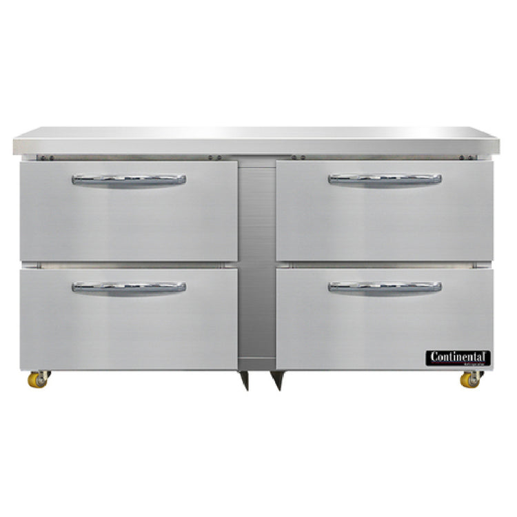 The Continental Refrigerator SWF60N-U-D Undercounter Freezer is a versatile and efficient refrigeration solution, offering a 60-inch width and a substantial 17.0 cubic feet capacity across its two-section design. It features four drawers, each accommodating one 12 x 20 x 6 pan, making it suitable for a variety of commercial kitchen environments. With a sturdy stainless steel front, top, and end panels, coupled with an aluminum interior, this undercounter freezer is built for durability and easy maintenance. The unit is equipped with 1-3/8-inch diameter plate casters for easy mobility. Its front breathing and rear-mounted self-contained refrigeration system, utilizing R290 Hydrocarbon refrigerant, ensures efficient operation and environmental compliance. Powered by a 1/2 HP compressor, the freezer is both cETLus and NSF certified, signifying adherence to strict safety and sanitation standards. This undercounter freezer represents a reliable and space-saving solution for professionals in the food service industry, offering a blend of robust construction, energy-efficient technology, and practical storage capabilities.
