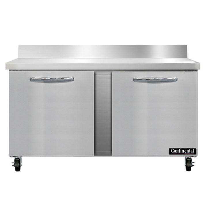 The Continental Refrigerator SWF60NBS Work Top Freezer - 60"W 17.0 Cu Ft Capacity is a highly efficient refrigeration unit designed for versatile usage across various industry sectors. Featuring a spacious 17.0 cubic feet capacity, this two-section freezer is perfect for commercial kitchens requiring substantial cold storage space. Its durable stainless steel construction includes a top with a 5-1/2" high backsplash, enhancing its utility as a work surface. The unit is equipped with two field rehingeable doors, offering flexibility in door placement to suit diverse kitchen layouts. The exterior showcases stainless steel front and end panels, while the interior is lined with aluminum for easy maintenance. The rear-mounted, self-contained refrigeration system utilizes R290 Hydrocarbon refrigerant and operates with a 1/2 horsepower motor, ensuring energy-efficient cooling. Certified by cETLus and NSF, the SWF60NBS adheres to stringent safety and sanitation standards. This work top freezer is an ideal solution for restaurants, catering services, and food processing facilities that demand reliable and adaptable cold storage solutions coupled with robust construction and modern refrigerant technology. Its thoughtful design and technical specifications cater to the high standards expected in professional settings, making it a valuable asset in any commercial kitchen.