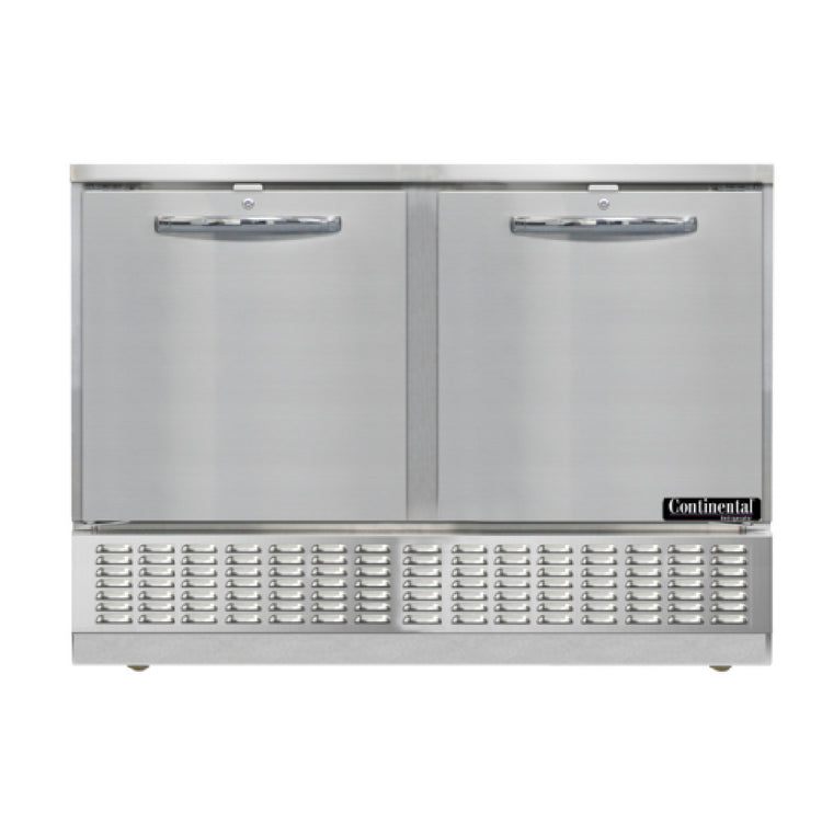 The Continental Refrigerator UC48SN Undercounter Refrigerator Shallow Depth 48" W stands out as a versatile and efficient refrigeration solution for commercial kitchens seeking compact yet robust storage options. With a shallow depth design, it perfectly fits into space-constrained areas without compromising on storage capacity, offering 8.6 cubic feet of space across two sections. The refrigerator features two field rehingable doors, allowing for flexible configuration to suit different operational needs. Constructed with a stainless steel front, top, back, and end panels, and an aluminum interior, it ensures durability and easy maintenance. The unit is mounted on 1-3/8" diameter plate casters for mobility, facilitating effortless relocation within a busy kitchen. Its front breathing design is complemented by rear-mounted, self-contained refrigeration utilizing R290 Hydrocarbon refrigerant and a 1/5hp compressor, ensuring energy efficiency and compliance with modern environmental standards. Certified by cETLus, NSF, and ENERGY STAR, the refrigerator meets rigorous safety and performance benchmarks, making it a reliable choice for various segments in the food service industry. This undercounter refrigerator is suitable for restaurants, cafes, and catering services that require dependable cooling solutions tailored to limited spaces.