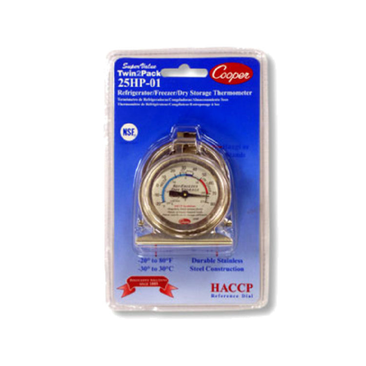 The Cooper Atkins 25HP-01C-2 Refrigerator/Freezer/Dry Storage Thermometer features a colored 2-inch dial specifically designed for zoned temperature monitoring, aligning with specific applications and HACCP guidelines. This thermometer is capable of measuring a temperature range from -25 to 27°C, ensuring precise temperature control crucial for maintaining food safety and quality standards in various storage environments. The device is NSF certified, signifying its compliance with public health and safety standards. Packaged conveniently in pairs (with 36 in a master carton), this thermometer is ideal for deployment across multiple storage units. The Cooper Atkins 25HP-01C-2 is particularly valuable for food service professionals who require reliable, accurate, and easy-to-read temperature measurement tools for critical storage areas, whether in commercial kitchens, restaurant freezers, or dry storage zones. Its colored dial not only enhances visibility but also helps in quickly identifying temperature zones, facilitating efficient monitoring and compliance with regulatory requirements. This product represents a strategic selection for industry professionals prioritizing food safety, operational efficiency, and adherence to established guidelines. The Cooper Atkins 25HP-01C-2 offers an essential solution for maintaining optimal storage conditions across diverse food service and storage environments.