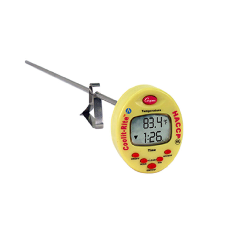 The Cooper Atkins TTM41-10 Coolit-Rite™ Cooling Validator is a precision instrument designed for rigorous temperature monitoring with a 10" (5mm) shaft length and a 2" shaft diameter. It features a sensor placed 2" from the tip, allowing for accurate readings within a temperature range of -4°F to 302°F (-20°C to 150°C). The device is engineered to deliver temperature accuracy of ±2°F (±3°C) from -4°F to 212°F (-20°C to 100°C) and ±3°F/±2°C above 212°F/100°C. Its timer accuracy is maintained at ±3 seconds per day, with a timer range of 6 hours and 59 minutes. This validator supports min/max/hold temperature functions, as well as timer count up/down capabilities. The large 1-1/4" x 1" (32mm x 25mm) LCD ensures easy readability in various conditions. With its water-resistant build and adjustable stainless steel vessel clip, it is suitable for diverse environments. The device also features anti-microbial housing, and it meets NSF, CE, RoHS, and WEEE standards, making it a reliable choice for food safety compliance across different industry sectors. The Cooper Atkins TTM41-10 is an essential tool for professionals requiring precise temperature validation in their processes.